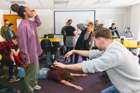 Dr Cressida Bowyer opened the conference with an icebreaker that set the stage for collaboration and camaraderie. The students came together to creatively act out each other's research topics, transforming complex studies into a series of short scenes. This activity broke the ice, sparked laughter, and fostered vibrant collaboration — as the photo below might suggest!