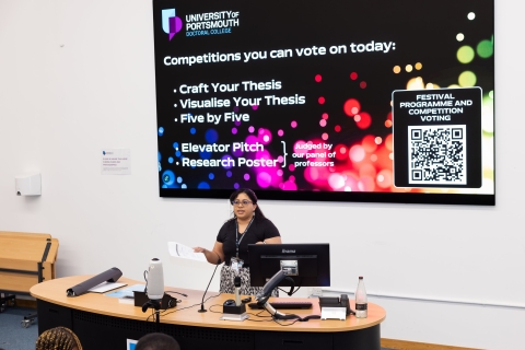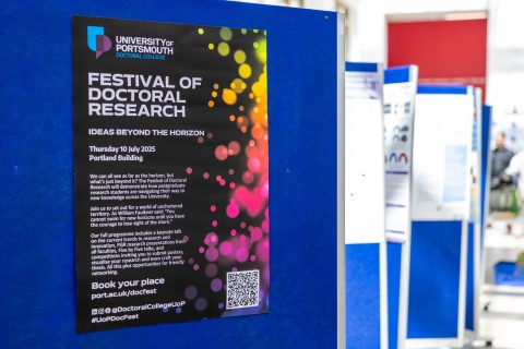 This annual event, known as DocFest, is the highlight of the Doctoral College’s calendar. It brings together postgraduate research students (PGRs) and University staff from every faculty to celebrate the vibrant and varied research that is going on at Portsmouth. Encouraged out of offices and labs, our PGRs have the opportunity to showcase their research to the wider University community.