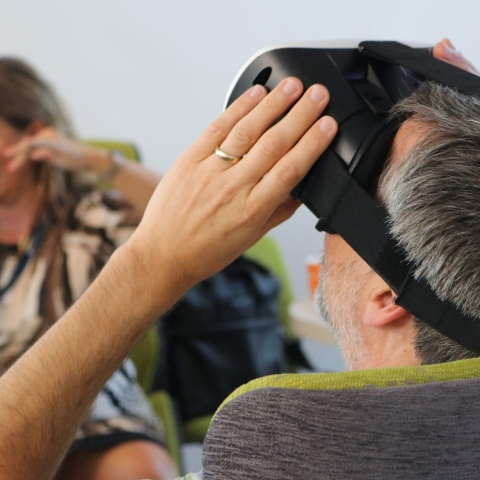 A staff member explaining to another staff member how a VR headset works